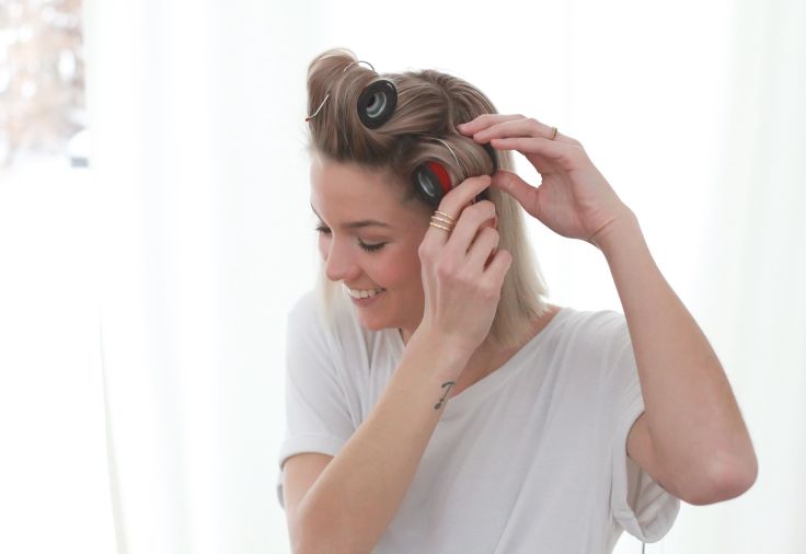Während die Heizwickler im Ladegerät vorwärmen, Haare mit einem Kamm in mehrere Partien unterteilen; sehr volle Mähnen mit einzelnen Klammern wegstecken. Die Heizwickler dann vorsichtig horizontal ins trockene Haar drehen und darauf achten, dass auch die Haarspitzen mit aufgewickelt werden. Für etwa 20 Minuten auskühlen lassen.