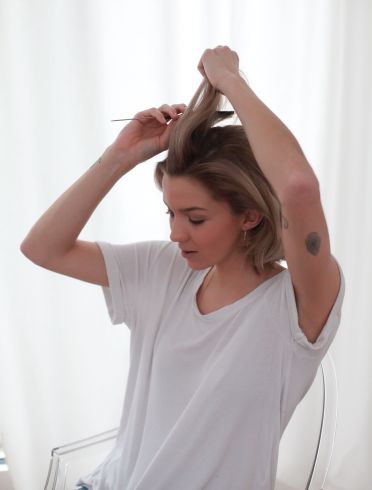 Die Wickler behutsam entfernen, die Haare mit den Händen etwas durchschütteln. Um das Volumen nicht zu zerstören, mit einem groben Kamm die Frisur etwas in Form bringen und mit einem federleichten Haarspray fixieren. Et voilà: Fertig ist der Homeoffice-Look.
