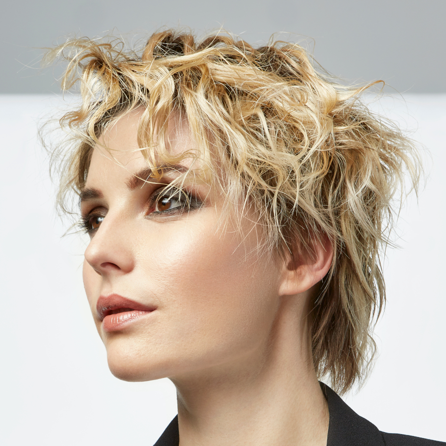 Ein bisschen ungemachter und lässiger zeigt sich der Kurzhaarschnitt in der Stylingvariante New Grunge. Hierfür wird das Deckhaar mit einem Stylingeisen gewellt und mit Hilfe eines Spraywaxes aufgerissen und seitlich ins Gesicht frisiert. Auch hier sorgt die Balayage-Technik für Tiefe und unterstützt die Struktur. Der Trendcut in der undone Curly-Edition verleiht seiner Trägerin einen rockigen Touch und ist die perfekte Ausgeh-Frisur.